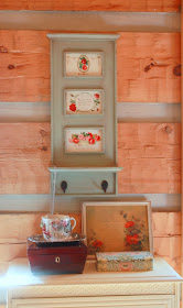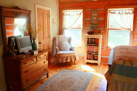 This room, like several in the house, has two log walls and two walls covered in a combination of drywall and beadboard. Maybe a little schizophrenic for decorating, but that's the nature of living in a log home. My spin on this is that there are lots of opportunities to contrast wood and painted surfaces and keep the house from being a sea of brown wood.
