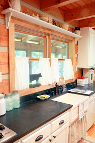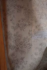Simple curtains sewn from fabric found at Hancock Fabrics dress the four windows. I have no idea the manufacturer of this semi-sheer, quilting fabric, but it reminded me a little bit of the linen and faded floral fabrics made famous by Cabbages & Roses, another iconic English company.