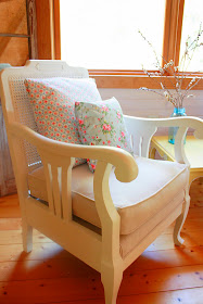 My winning entry was the cane back living room set I painted and then had reupholstered in drop cloths for my English-inspired reading nook. I shared with you guys