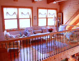 This loft is just 8 feet wide and runs 15 feet long, and it overlooks the living room and dining room below.