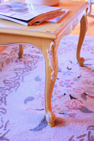 A pair of gorgeous yellow French Provincial tables from Spruce Antiques are a fun, colorful counterpart to the subtle hues of the cream and grey-painted furniture and drop cloth cushions. They pick up the hints of yellow in the Cath Kidston pillows and further brighten the space. The vintage hooked rug is a neutral backdrop to this sassy table.