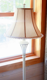 The floor lamp was a purchase made by my husband in his bachelor days. A quick coat of white spray paint on the base, and white pom-pom fringe hot glued to the beige shade, spiffed it up in a whimsical kind of way.