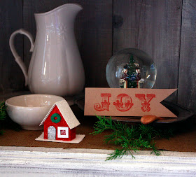 Everyone else, here's one of about a dozen ornament-sized glitter houses I made last week.  I'll take photos before they're given as gifts and share them with you in my next post.  I just had to sneak one in here because I was so happy with the way they turned out. :)  (P.S.--The delightful paper JOY tag came with the goodies from Stacey's giveaway and I thought it was just perfect to incorporate into the decorations.)