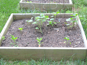 | This is one of the more recently planted beds. As you can tell, I didn't mark off square foot blocks. This is about 4' by 4' and in it is four bell pepper seedlings and four pickling cucumber plants. |