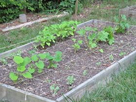 | One of the first beds planted and it's full of peas, green beans, squash, zucchini, watermelon and canteloupe plants. |
