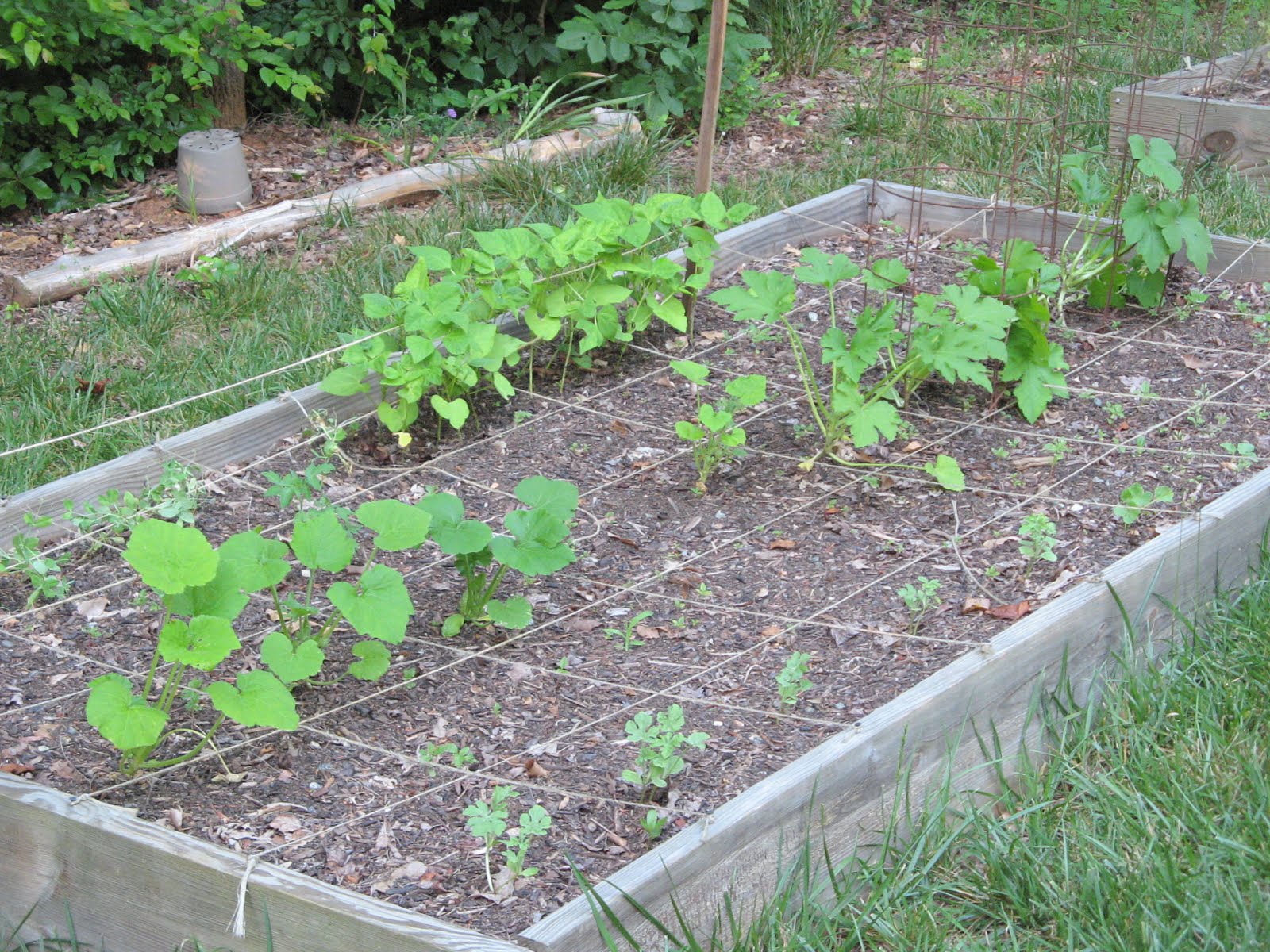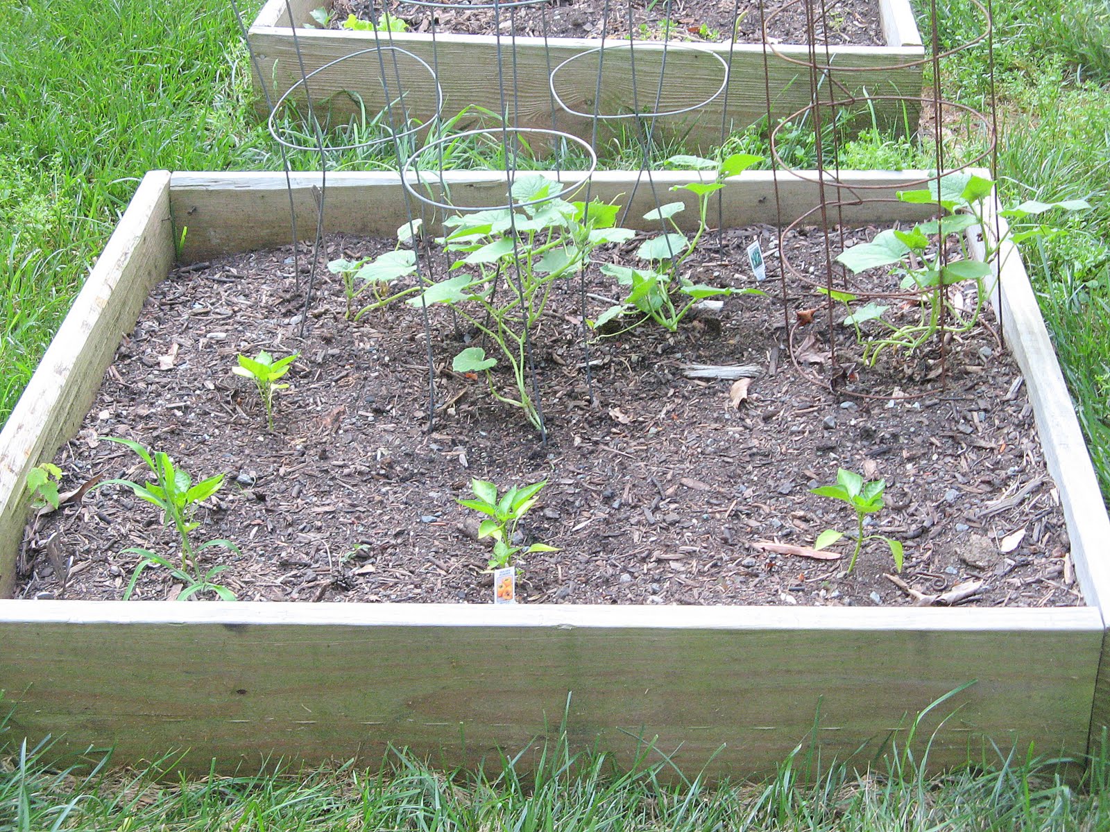 This is one of the more recently planted beds. As you can tell, I didn't mark off square foot blocks. This is about 4' by 4' and in it is four bell pepper seedlings and four pickling cucumber plants. |